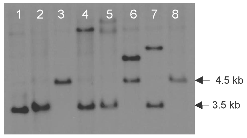 KpnI-digested genomic DNA of D. septosporum wild-type (lanes 1 & 2) or transformed with pR260 (lanes 3-8) and hybridized with a dotC coding region probe. KpnI sites flank the dotC gene, hence replacement of a 1.4 kb central portion of dotC with a 2.4 kb hygromycin resistance gene cassette increased the dotC-containing KpnI fragment size from 3.5 kb (wild-type) to 4.5 kb (dotC replacement). The dotC replacement mutants FJT16 and FJT15 are shown in lanes 3 and 8 respectively. Lane 6 contains another dotC mutant that had an additional ectopic integration of the pR260 plasmid.