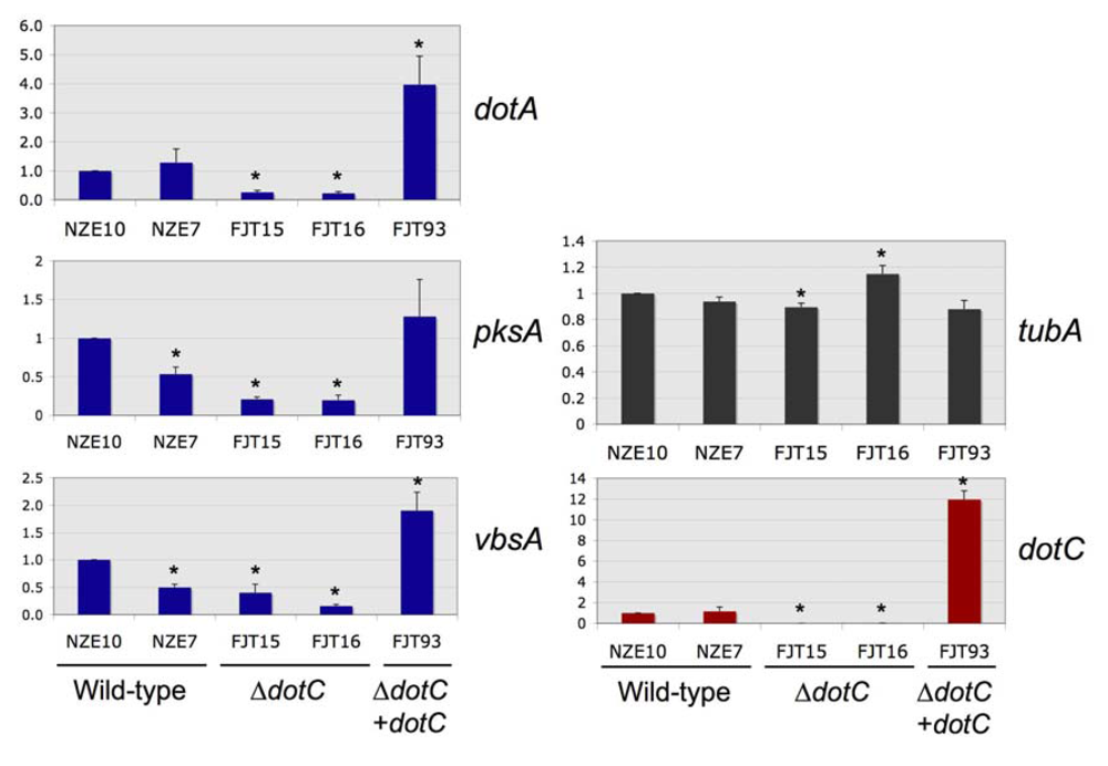Expression of dotC, dothistromin genes dotA, pksA and vbsA, and beta tubulin (tubA, constitutive control) in wild type, dotC knockout (∆dotC) and complemented (∆dotC + dotC) strains. 18S ribosomal RNA was used as a reference gene for standardisation. Values are normalised expression ratios relative to the NZE10 wild type, shown as mean ± standard error (n = 6). *Significant differences from NZE10 (P < 0.05) are shown by an asterisk.