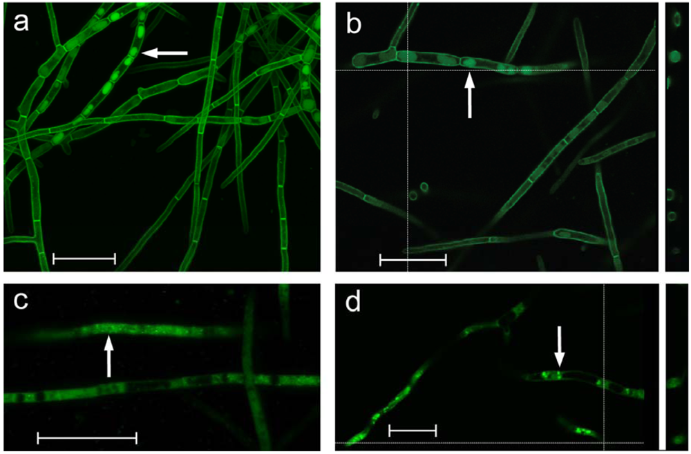 GFP fluorescence of D. septosporum transformed with dotC-gfp (a, b) or dotA-gfp (c, d). Confocal Laser Scanning Microscopy (CLSM) images on the left (a and c) are combined 0.2 μm Z-stacks. Images on the right (b and d) are single-layer snapshots, with vertical cross-section profiles illustrated on the right. White arrows indicate intracellular vesicles/vacuoles showing GFP-fluorescence. Vesicles in (c) are very small. Scale bar = 20 μm.