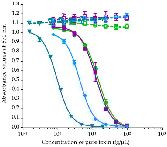 The absorbance was measured at 570 nm using a plate reader (iMark Microplate Absorbance Reader, BioRad, Marnes la Coquette, France). For all experiments, absorbance values of OV− and OV+ control wells were around 1 corresponding to 100% viability. Absorbance data were fitted to a sigmoidal dose-response curve (variable slope) based on the four-parameter logistic model (4PL) allowing the calculation of EC50 values using Prism v6.0.7 software (GraphPad, San Diego, CA, USA). Since raw results for all extracts were obtained in pg/µL of dry extract, the EC50 values for T. niloticus and Gambierdiscus samples were further expressed in µg flesh equiv./µL and in cells equiv./µL, respectively.