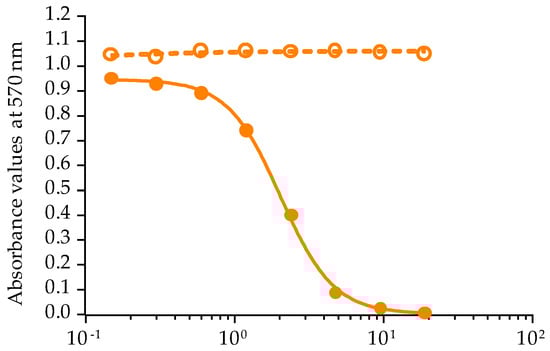 Following another 20–22-h incubation period, cell viability was assessed using the MTT assay. The incubation medium was removed, and 60 µL of RPMI-1640 medium containing 0.8 mg/mL of 3-(4,5-dimethylthiazol-2-yl)-2,5-diphenyl tetrazolium bromide (MTT) were added to each well. The plates were incubated for 45 min at 37 °C. Finally, the MTT was discarded, and 100 µL of dimethyl sulfoxide (DMSO) were added to each well to dissolve the formazan.