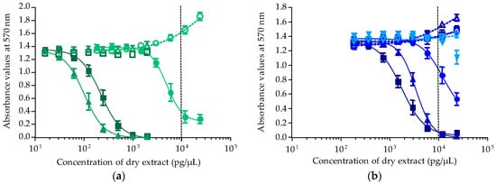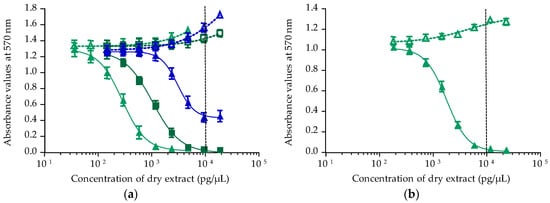 Dose-response curves of neuro-2a cells in OV− (open symbols) and OV+ (solid symbols) conditions, when exposed to increasing concentrations of T. niloticus fractions (Anaho Bay July 2014). (a) Liposoluble fractions LF70/30 (○/●), LF90/10 (△/▲) and LF100 (□/■); (b) hydrosoluble fractions HF50/50 (▽/▼), HF70/30 (○/●), HF90/10 (△/▲) and HF100 (□/■). Data represent the mean ± SD of two independent experiments (each run in triplicate). The dotted vertical line corresponds to the maximum concentration of dry extract (MCE = 10,000 pg/µL) for matrix interferences.