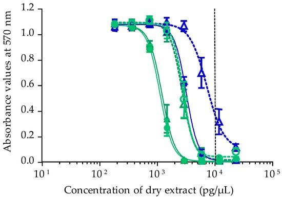 Dose-response curves of Neuro-2a cells in OV− (open symbols) and OV+ (solid symbols) conditions, when exposed to increasing concentrations of T. niloticus fractions originated from Taipivai (November 2016) LF70/30 (○/●), LF90/10 (△/▲) and HF90/10 (△/▲) following the CBA-N2a procedure described in Section 4.4. Data represent the mean ± SD of two independent experiments (each run in triplicate). The dotted vertical line corresponds to the maximum concentration of dry extract (MCE = 10,000 pg/µL) for matrix interferences.