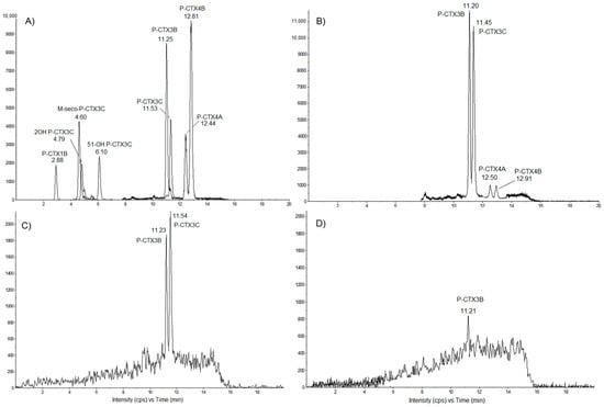 In addition to the detection of P-CTXs, other marine biotoxins were investigated according to methods previously described [,,]: neurologic shellfish toxins (NSP), i.e., brevetoxins (PbTX1–PbTX10), paralytic shellfish poisoning (PSP) toxins, i.e., carbamates (STX, NEO-STX, GTX1–GTX4), N-sulfocarbamoyl (GTX5, GTX6 and C1–C4) and decarbamoyls (dcSTX, dcNEO, dcGTX1–dcGTX4); diarrhetic shellfish poisoning (DSP) toxins, i.e., okadaic acid (OA), dinophysistoxins (DTXs), pectenotoxins (PTXs), azaspiracids (AZAs) and yessotoxins (YTXs); cyclic imines (fast action toxins (FAT)): gymnodimines (GYMs), spirolides (SPXs) and pinnatoxins (PnTXs).
