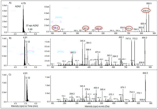 Chromatographic peaks of the m/z 856.6 ion with the corresponding MS/MS spectra of (A) AZA2 (AZA, azaspiracid) from National Research Council Canada (NRC) at 4.79 min; (B,C) Tectus niloticus extract from Taipivai collected in November 2016, at respectively, 4.91 min and 5.12 min. MS/MS spectra of the m/z 856.6 were obtained using positive enhanced product ion (EPI) mode with a collision energy (CE) of 50 eV and a collision energy spray (CES) of 20 eV. Specific fragment ions of the azaspiracid group are indicated in red.