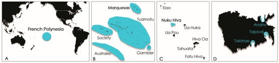 Maps of French Polynesia (A,B) and Nuku Hiva Island (Marquesas archipelago), (C) showing the locations of the 3 study sites and (D) areas sampled in this study.