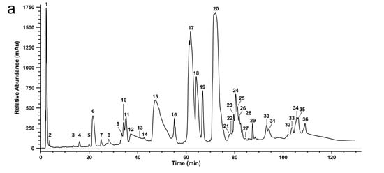 Intact molecular mass profiles of V. a. transcaucasiana (Vat) and V. a. montandoni. (Vam). The total ion counts (TIC) of crude venoms from: (a) Vat; and (b) Vam were measured by HPLC-ESI-MS. The peak nomenclature is based on the chromatogram fractions and is shown in Figure 3. The identified molecular masses of intact proteins and peptides are listed for Vat in Table S1 and Vam in Table S2.