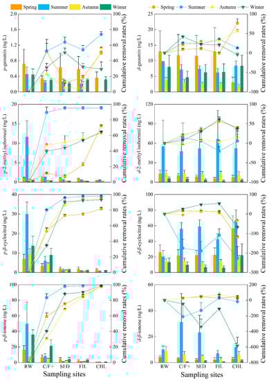 | p-β-ionone (ng/L) | 14.5 (1.8–30.1) | 53.4 (2.6–152.7) | 4.8 (0.7–11.6) | 47.1 (3.5–115.8) |