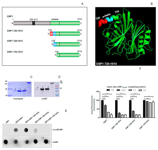 Cytotoxic Necrotizing Factor 1 (CNF1) 730–1014 shows no interaction, CNF1 726–1014 shows weaker interaction with rLu/BCAM in comparison to CNF1 and CNF1 720–1014. (A) Schematic representation of CNF1 and its truncated versions with the α-helix of interest highlighted; (B) crystal structure of the catalytic part of CNF1 from amino acid 720 to 1014, the α-helix of interest from amino acid 720 to 733 is highlighted; (C,D) enrichment of GST-CNF1 (1), GST-CNF1 720–1014 (2), GST-CNF1 726–1014 (3), and GST-CNF1 730–1014 (4) verified via SDS-PAGE following Coomassie staining (C) or an immunoblot using an anti-GST antibody (D); (E) dot blot binding analysis, different CNF proteins were dotted on a nitrocellulose membrane and incubated with rLu/BCAM for 30 min. After blocking the membrane with skimmed milk, detection of rLu/BCAM was performed with an anti-Lu/BCAM antibody; (F) flow cytometry competition studies, suspension of HeLa cells (3 × 105 cells in 1 mL medium) were preincubated with different unlabeled N-terminal truncated CNF1 proteins, respectively. Then, cells were washed with PBS and incubated with DyLight488-labeled GST-CNF1 (as control cells were incubated with labeled CNF1 without preincubation and set to 100%). Following washing with PBS, cells were subjected to flow cytometry measurements. The bound fluorescence is shown in comparison to the control. Data shown represent three independent experiments + standard deviations. Statistical analyses were performed using two-way ANOVA. * p < 0.05; *** p < 0.001; **** p < 0.0001.
