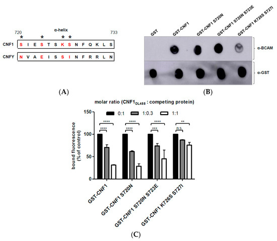 Analysis of the binding of CNF1 mutants to Lu/BCAM. (A) amino acid sequence of CNF1 α-helix of interest from amino acid 720 to 733 in comparison to CNFY, * indicate mutated amino acids; (B) dot blot binding studies, different CNF proteins were dotted on a nitrocellulose membrane and incubated with rLu/BCAM for 30 min. After blocking the membrane with skimmed milk, detection of rLu/BCAM was performed by an anti-Lu/BCAM antibody. As a loading control, the membrane was incubated with an anti-GST antibody; and, (C) flow cytometry competition studies, suspension of HeLa cells (3 × 105 cells in 1 mL medium) were preincubated with several unlabeled CNF proteins in different molar ratios, respectively. Then, cells were washed with PBS and incubated with DyLight488-labeled GST-CNF1 (as control cells were incubated with labeled CNF1 without preincubation and set to 100%). Following washing with PBS, cells were subjected to flow cytometry measurements. Bound fluorescence is shown in comparison to the control. Data shown represent three independent experiments + standard deviations. Statistical analyses were performed using two-way ANOVA. ** p < 0.01; *** p < 0.001; **** p < 0.0001.