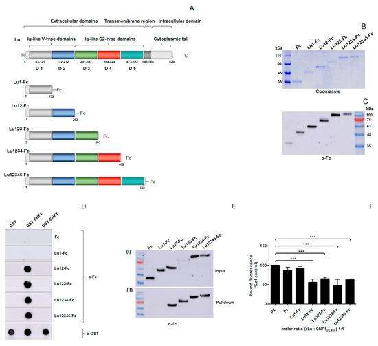 Domain 2 of Lu/BCAM is involved in binding to CNF1. (A) schematic representation of Lu with its extracellular, transmembrane and intracellular part; (B,C) purification of different Lu-Fc proteins and verification via SDS-PAGE (B) and western blotting using an anti-Fc antibody (C); (D) dot blot interaction studies, different CNF proteins were dotted on a nitrocellulose membrane, following blocking of the membrane with skimmed milk. After incubation with different Lu-Fc proteins, respectively, the Lu-Fc proteins were detected using an anti-Fc antibody. GST and GST-CNFY were used as negative controls; (E) GST pulldown assay with cell culture supernatants of Lu-Fc expressing COS7 cells. Cell culture supernatants of Lu-Fc expressing COS7 cells were incubated with beads-coupled GST-CNF1, respectively. After washing, the beads-coupled proteins were eluted with Laemmli sample buffer and separated by SDS-PAGE. Co-immunoprecipitation of Lu-Fc proteins was detected using an anti-Fc immunoblot (II). As Input, samples from the cell culture supernatants were taken before incubation with beads (I); (F) flow cytometry binding studies, DyLight488-labeled GST-CNF1 was pre-incubated with different Lu-Fc proteins respectively followed by an incubation with a suspension of HeLa cells (3 × 105 cells in 1 mL medium). As positive control cells were incubated with DyLight488-labeled CNF1 without preincubation with Lu-Fc. After washing three times with PBS, cells were subjected to flow cytometry measurements. The bound fluorescence is shown in comparison to the positive control, which was set to 100%. Data shown represent three independent experiments + standard deviations. Statistical analyses were performed using one-way ANOVA. *** p < 0.001.
