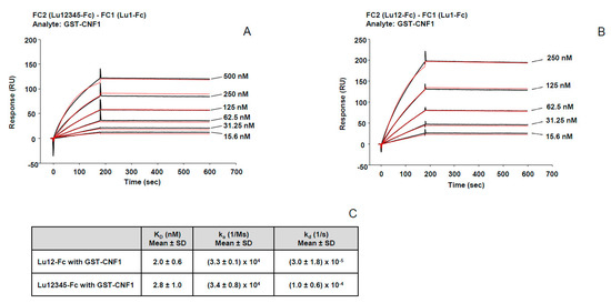 Lu12345 and Lu12 bind with similar affinity to CNF1. (A) Binding sensorgram for GST-CNF1 interaction with immobilized Lu12345-Fc. Lu1-Fc was immobilized on FC1, Lu12345-Fc on FC2. 6 different GST-CNF1 concentrations ranging from 15.6 nM, 31.25 nM. 62.5 nM, 125 nM, 250 nM up to 500 nM were injected. Shown is the sensorgram FC2-FC1; (B) binding sensorgram for GST-CNF1 interaction with immobilized Lu12-Fc. Lu1-Fc was immobilized on FC1 on a CM5 sensor chip, Lu12-Fc on FC2. As a ligand GST-CNF1 was injected at five different concentrations from 15.6 nM, 31.25 nM, 62.5 nM, 125 nM up to 250 nM. Shown is the sensorgram FC2-FC1. The red curves in (A,B) represent the fitted data estimated by the Biacore X100 Evaluation Software (Version 2.0, GE Healthcare, Little Chalfont, UK); (C) a table showing the affinity constant (KD), the association rate constant (ka) as well as the dissociation rate constant (kd) based on the kinetics calculated with the Biacore X100 calculation Software (Version 2.0, GE Healthcare, Little Chalfont, UK), n = 2; Mean ± SD. The presented results in (A,B) represent one of at least two independent replicates.