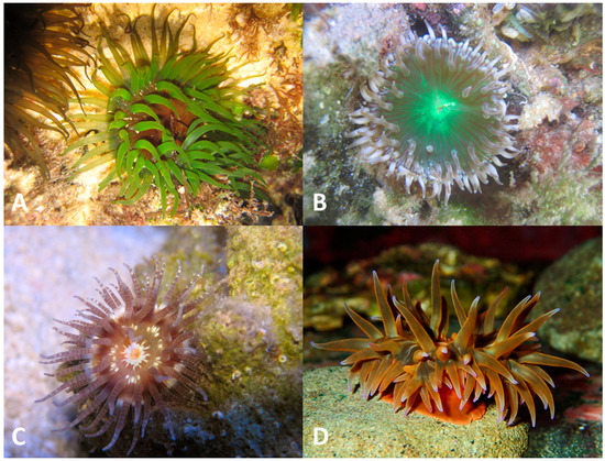 - Schama, R.; Mitchell, M.; Sole-Cava, A.M. Actinia ebhayiensis sp. nov., a new species of sea anemone (Anthozoa: Actiniaria: Actiniidae) from South Africa. J. Mar. Biol. Assoc. UK 2012, 92, 885–894. [Google Scholar] [CrossRef]