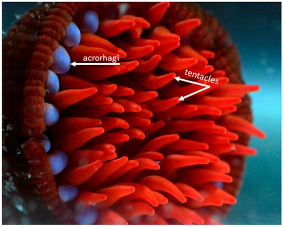 Sea anemones, in common with other members of the phylum Cnidaria, possess numerous specialized stinging cells (cnidocytes) that are widely distributed throughout the body [16]. These stinging cells are equipped with organelles known as nematocysts (cnidae), which contain small threads that are forcefully everted when stimulated mechanically or chemically [17]. These nematocysts contain a complex cocktail of toxins that is used to envenomate predatory and prey species upon discharge [1,3,6]. Nematocysts show significant heterogeneity in their density and morphology across different structures within sea anemones [18]. For example, in Actinia tenebrosa (or its northern hemisphere relatives Actinia equina and Actinia fragacea), acrorhagi (which are used in aggressive intra-specific combat (Figure 2)) contain holotrichs and basitrichs [19] (Figure 3), while the tentacles (which are used in prey capture and defence) contain basitrichs and spirocysts; basitrichs are also found in the mesenteric filaments, column, pedal disc and actinopharynx [19] (Figure 3). The differences in cnidae composition are related to differences in the functional specialization of morphological structures, i.e., the capture of prey (crustaceans, small fish), defence against predators and intraspecific aggression [19,20,21,22].