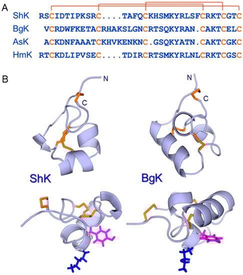 (A) Amino acid sequences of ShK (UniProt entry P29187) [48], BgK (P29186) [65], AsK (Q9TWG1), also known as kaliseptine [66], and HmK (O16846) [67] with the three disulfide bonds indicated. (B) Structures of ShK (pdb id 1ROO) [50] and BgK (pdb id 1BGK) [51] are shown, with backbones in lightblue and disulfides in orange. The side chains of the Lys and Tyr that constitute the functional dyad [51] in each peptide are shown in blue and magenta, respectively. This dyad is displayed on a helical scaffold in ShK but a β-sheet in the scorpion toxins charybdotoxin and margatoxin (not shown).