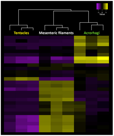 Gene expression patterns for all gene copies of the venom Kunitz gene family across tentacles, mesenteric filaments and acrorhagi in A. tenebrosa. Tissue-specific expression can be observed among copies across the three tissues, with significantly upregulated transcripts in yellow and downregulated transcripts in purple (our unpublished data).
