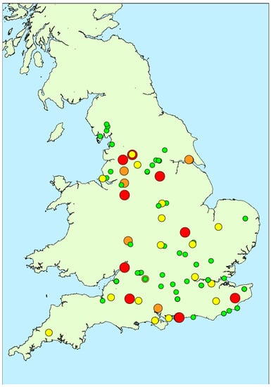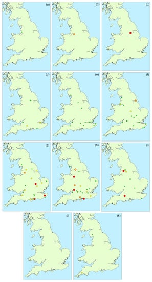 Occurrence and magnitude of total microcystins in water samples throughout England during 2016: (a) February; (b) March; (c) April; (d) May; (e) June; (f) July; (g) August; (h) September; (i) October; (j) November; (k) December (red: >100 μg/L; orange: 20–100 μg/L; yellow: 2–20 μg/L; green: <2 μg/L).
