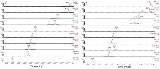 SRM chromatograms for individual microcystin analogues detected in (a) high level calibration standard (b) sample containing the highest total toxin result (sample 114). MC = Microcystin.