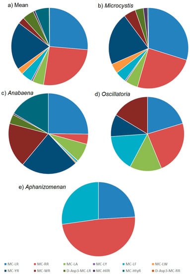 Proportions of microcystin analogues quantified in water samples from England illustrating toxin profiles from (a) all samples (b) Microcystis bloom samples (c) Anabaena (d) Oscillatoria and (e) Aphanizomenon.