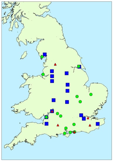 Figure 4 illustrates the spatial distribution of microcystin positive water samples obtained throughout England during 2016. During the first three months (February to April), only one bloom sample per month was tested, with all three originating from the north of the country. During May and June, more blooms were found in the southern areas, although the majority did not contain microcystins above 2 μg/L. Between July and October, an even spread in bloom occurrence was evident across the country, with high microcystin concentrations determined in samples in both the north and the south, as well as the central and south-eastern regions. Overall, there was no visual indication of any geographically-related patterns of microcystin abundance in the bloom samples received throughout the year.