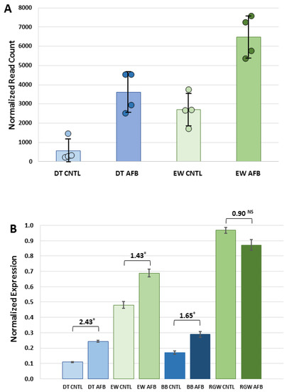 To more broadly examine the expression profile response of GSTA3 to dietary AFB1, quantitative real-time PCR (qRT-PCR) was performed on both domesticated and wild turkey liver samples. Samples included AFB1-treated and control animals (six per group) from the domesticated Nicholas turkey (DT) and Eastern Wild (EW) experiment, plus AFB1-treated and control animals (six per group) of a parallel experiment that included domesticated Broad Breasted White (BB), and birds of the Rio Grande subspecies (RGW, M. g. intermedia) of wild turkey. Four of the six samples for the DT and EW groups were in common with the RNA-seq study.