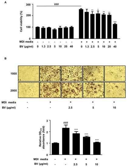 Hyperplasia and lipid accumulation are known to occur in the 3T3-L1 cell line during differentiation [8,27]. 3T3-L1 cells were treated with BV (concentrations from 1.25 to 40 μg/mL) in the differentiation media (MDI) or the growth media (BS). After treatment with BV, the cell viability was determined by a 3-(4,5-Dimethylthiazol-2-yl)-2,5-diphenyl tetrazolium bromide (MTT) assay (Figure 1A). BV had no effect on the cell viability in the culture media. However, BV significantly reduced the cell viability at 2.5 μg/mL or higher concentrations during the differentiation of adipocytes.
