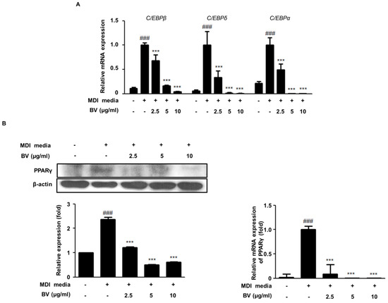 Transcription factors, such as PPARγ and the C/EBP family, are known to play important roles during the maturation and the differentiation of adipocytes [2,28]. In this study, we investigated the anti-adipogenesis activity of BV in differentiated adipocytes using qRT-PCR and Western blot analysis. As shown in Figure 2, the mRNA expression of C/EBPα, C/EBPβ, C/EBPδ, and PPARγ was upregulated in differentiation-induced adipocytes, compared to what was seen in undifferentiated cells. However, the treatment with BV significantly downregulated the mRNA expression of the C/EBP family and decreased PPARγ expression (both mRNA and protein levels; Figure 2B).