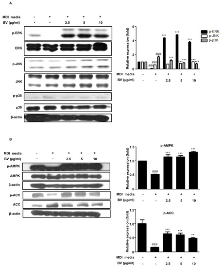 Mitogen-activated protein kinases (MAPKs) play a crucial role in many essential cellular responses, including proliferation, apoptosis, and differentiation [29]. In particular, MAPKs are associated with regulatory effects on adipocyte differentiation [30]. To investigate the effect of BV on the MAPK pathway, we determined the protein expression of factors involved in the MAPK pathway using Western blot analysis in differentiated adipocytes. As shown in Figure 3A, the phosphorylation of ERK and JNK decreased, whereas the phosphorylation of p38 increased during differentiation, compared to that of the undifferentiated control cells. The phosphorylation of ERK and JNK was upregulated in the BV-treated adipocytes and the phosphorylation of p38 was significantly decreased.