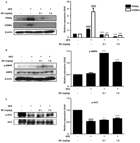 The adipogenic transcription factors, PPARγ and C/EBPα, regulate the genes for fat accumulation. Several in vivo studies have shown that PPARγ plays a crucial role in adipogenesis [9,33]. The inhibition of adipogenesis in the BV-treated groups was investigated and was found to be associated with molecular signaling, by the adipogenic markers involved in lipid metabolism and adipogenesis. We examined the protein expression of PPARγ and C/EBPα in adipose tissue, and it was significantly upregulated in the HFD group. In contrast, the expression of factors related to adipogenesis decreased in the BV-treated groups, compared to the expression in the HFD group.
