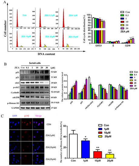 ZEA induced G2 phase arrest in SCs. (A) After treatment with different concentrations of ZEA for 24 h, the cell cycle changes were detectable by flow cytometry; (B) The influence of protein expression of SCs in the G2/M phase versus control (* p < 0.05, ** p < 0.01); (C) Immunofluorescence analysis of the number of sensitive mitotic cell marker p-Histone H3–positive cells after ZEA treatment.