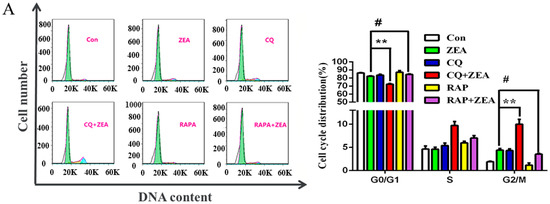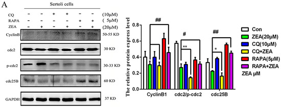 When the cells were disposed with 10 μM ZEA for 24 h and autophagy inhibitor (CQ) and autophagy promotor (RAPA) were then added, cell cycle changes were detectable by flow cytometry (Figure 5A). Compared with the ZEA-only group, after using autophagy inhibitor CQ, the percentage of SC in the G2/M phase was increased significantly (* p < 0.05). After co-treatment with RAPA, the proportion of SCs in the G2/M phase was decreased significantly (* p < 0.05). These results have indicated that autophagy could reverse the G2/M phase arrest of SCs cell cycle induced by ZEA.