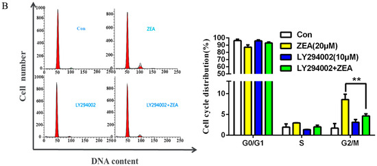 To further clarify the effect of PI3K/Akt/m TOR pathway in ZEA-induced G2 arrest of SCs, the cells in the logarithmic phase were pre-treated with PI3K inhibitor (LY294002) for 30 min and then exposed to ZEA for another 24 h, the cell cycle changes were detected by flow cytometry. The results are shown in Figure 5B, Compared with the ZEA-only group, after the addition of PI3K inhibitor (LY294002), the percentage of SCs in the G2/M phase decreased significantly (* p < 0.05). These results have shown that using the PI3K inhibitor (LY294002) to promote the level of autophagy could also reverse the cell cycle arrest induced by ZEA in SCs.