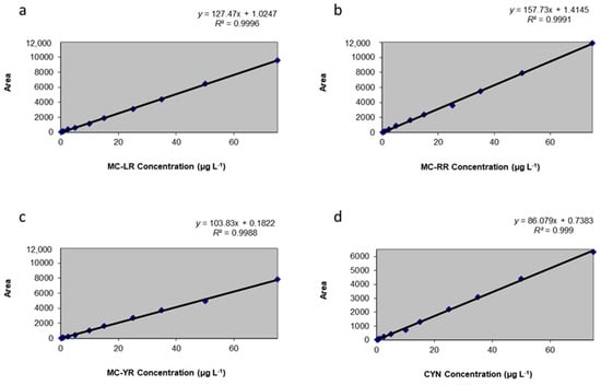 Calibration curves obtained for (a) Microcystin-LR (MC-LR); (b) MC-RR; (c) MC-YR; and (d) Cylindrospermopsin (CYN) in lettuce.