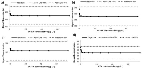 Linearity of an analytical method with regards to the analysis of a number of samples varying in analyte concentrations followed by regression statistics were performed []. Twelve different concentrations of the mixture solution containing MCs and CYN were spiked to blank extracts of lettuce leaves (n = 3) and the samples were submitted to the present validated method. According to Huber et al. [] the calibration plot, which represents the signal response/analyte concentration relationship versus analyte concentrations, was assessed by replicate analysis (n = 3) of the extracts at 0.2–75 µg toxins L−1. The target line in Figure 2 represents the median signal/concentration calculated for all the concentrations evaluated. The results obtained for each concentration assayed are within the median value ±5% for MC-LR, MC-RR, MC-YR, and CYN, demonstrating the linear range of the proposed method.