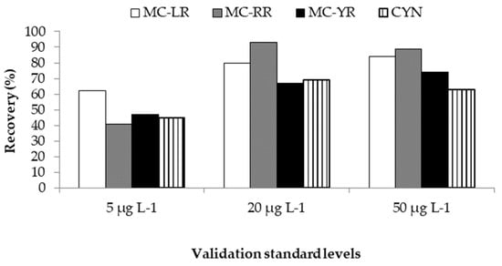 Trueness is the closeness of agreement between a test result and the accepted reference value of the property being measured and it can be investigated by spiking and recovery []. Total recovery for any validation method is defined as the ratio between the observed estimation of the validation standard concentrations and the true value, T, expressed as a percentage or fraction []. The recoveries obtained in the present study were in the range of 62–84% (MC-LR), 41–93% (MC-RR), 47–74% (MC-YR), and 45–69% (CYN) (Figure 3). The adequacy of these results was checked with the recovery values accepted for each concentration range, which are 40–115% for 5 µg L−1 and 60–110% for 20 and 50 µg L−1 []. As can be observed in Figure 3, MC-LR showed the best recoveries at lower concentrations (5 µg L−1), whereas at higher concentrations (20 and 50 µg L−1), it seems that better recoveries are obtained for MC-RR followed by MC-LR. In general, slightly better results have been obtained for MCs compared to CYN. Previously, high recoveries (104% for 20 µg L−1) were shown for CYN in a validated method for determination of this toxin in lettuce []; however, in the present work, CYN recovery percentages resulted in compromised favor of the extraction and detection of more hydrophobic cyanotoxins, such as MCs.