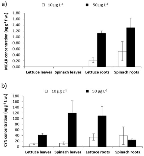 (a) MC-LR and (b) CYN concentrations detected in the leaves and roots of lettuce and spinach exposed to cyanobacterial extracts under laboratory conditions.
