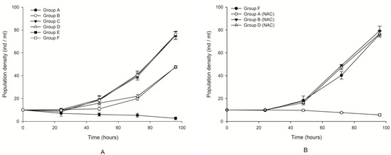 Effects of different treatment fluids on the population growth of Brachionus plicatilis with and without N-acetylcysteine (NAC) addition. Points were the mean ± standard error based on three replicates. (A) The growth curve of rotifers cultured with sterilized seawater as the control group (Group F) (□), or different treatment fluids of Karenia mikimotoi, Group A (●), Group B (○), Group C (▼), Group D (∆), Group E (■). (B) The growth curve of rotifers cultured with sterilized seawater as the control group (Group F) (●), or different treatment fluids of K. mikimotoi added NAC, Group A (NAC) (○), Group B (NAC) (▼), Group D (NAC) (∆).
