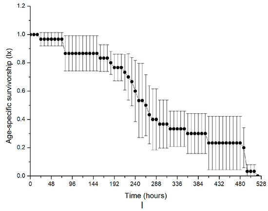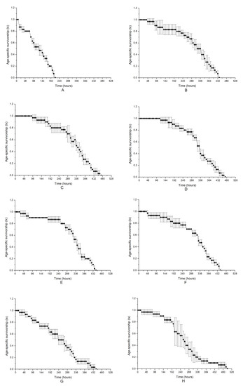 Ten neonates (<2 h) were placed in 24-well tissue culture plates co-cultured with different microalgal treatment fluids of K. mikimotoi. Following inoculation, we counted the number of neonates born, the surviving adults, and the eggs produced every 4 h during the first 72 h and every 8 h during the rest of the experiment. Then, the dead individuals and neonates were removed when they were found. The survival rate and the life table parameters including the net reproductive rate (R0), intrinsic rate of growth (rm), generation time (T), life expectancy (E0) and intrinsic growth rate (λ) were recorded according to previous documents [60,61,62]. This method was described by Hitchcock et al. Krebs et al. and Pianka et al. Other cultivating conditions were the same as those noted above, without other descriptions [61,62,63].