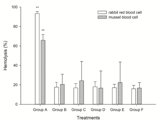 The hemolytic activity of different treatment fluids on rabbit and mussel blood cells. **: means extremely significant difference (p < 0.01, n = 3).