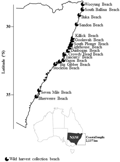 End-product market survey shellfish sample collection focused on Sydney Fish Market, Sydney, Australia, as most wild harvest shellfish collected in NSW is consigned through the market for auction. Between November 2015 and December 2017, 323 wild harvest shellfish samples were collected (Table S1). Wild shellfish harvest is focused on mid-north and north coast beaches in NSW (Figure 1, Figure S2). Pipis were the predominant wild harvest shellfish available for sale at the time of sampling (Table 2). Sampling frequency was increased from monthly to weekly between September and December during each year (Table S1) in line with historical phytoplankton data and positive DST detections from wild harvest beaches in NSW [26,45]. Depending on the amount of wild harvest stock on sale, more than one sample from a wild harvest beach was collected, as often multiple licensed individuals collect shellfish on the same beach. In addition, on some beaches there were more than one wild harvest collection group operating (Table S2). Each shellfish sample was a homogenate of the soft tissue of 15–20 individual shellfish (min. 100 g of meat was collected). The samples were kept chilled and either delivered to a National Association of Testing Authorities (NATA) accredited biotoxin laboratory (Symbio Laboratories, Sydney) within 1 h of collection or frozen (−20 °C) for later analyses.