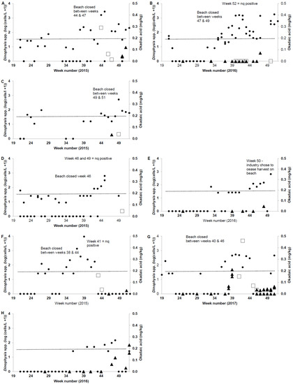An alternative comparison was the positive, above regulatory limit, biotoxin result of 0.23 mg/kg OA to phytoplankton results. The positive sample was from Lighthouse Beach (Figure 1) and pipis collected on 19 December 2016. The preceding phytoplankton samples from this beach did not indicate an increase in Dinophysis spp. (Figure 2H), with cell concentrations <150 cells/L.