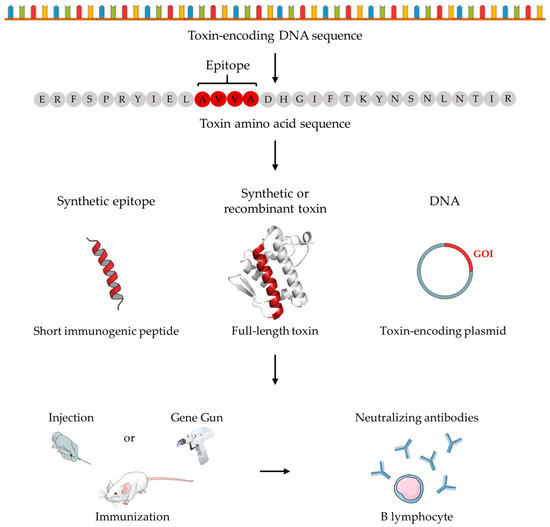 Schematic illustration of the most studied innovative immunization strategies explored for antivenom development. Based on the amino acid sequence of the toxin(s) of interest, short immunogenic peptide(s) or full-length toxin(s), synthetically or recombinantly produced, can be injected into animals. Immunization with the peptide(s) or toxin(s) will lead to a toxin-specific immune response mediated by antibody-producing B lymphocytes. Alternatively, based on the DNA sequence(s) of the toxin(s), a plasmid encoding the gene(s) of interest (GOI) can be transfected into animal cells using a Gene Gun. Following transfection, the animal cells will translate the transcript derived from the plasmid, generating a toxin able to raise a toxin-specific immune response with subsequent production of antibodies by B lymphocytes.