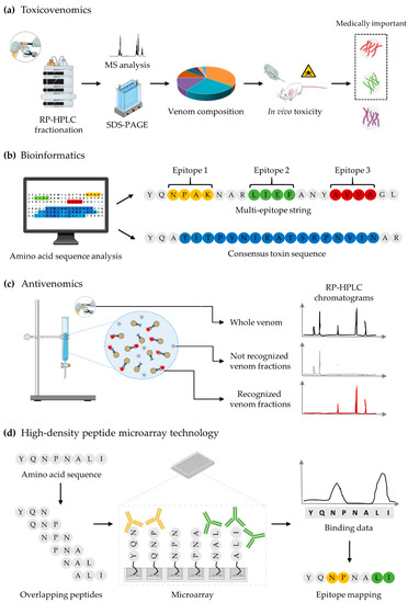 Schematic illustration of biochemical, bioinformatic, and omics tools that could aid antivenom development. (a) Toxicovenomics: Venom composition is determined through venomics. Here, venom is fractionated by reversed-phase high-performance liquid chromatography (RP-HPLC). Subsequently, components of each venom fraction are identified by combining sodium dodecyl sulfate-polyacrylamide gel electrophoresis (SDS-PAGE) and mass spectrometry (MS) analysis. The toxicity of each venom fraction is evaluated in vivo to identify the medically relevant components an antivenom should target. (b) Bioinformatics: Online resources can be used for in silico prediction of epitopic elements and regions of homology from toxin sequences. Predicted epitopes and homologous regions can then be utilized to generate multi-epitopic strings or consensus toxin sequences, respectively. Such strategies aim at generating an immune response against multiple toxins using a single molecule or to generate cross-reactive antibodies. (c) Antivenomics: This approach is employed to assess antivenom reactivity and cross-reactivity based on immunoaffinity. By comparing the chromatographic profiles of whole venom, unbound, and bound venom components, it is possible to discriminate between venom fractions recognized and not recognized by antivenom antibodies. (d) High-density peptide microarray technology: Short overlapping peptides from toxin amino acid sequences are synthesized to study epitope-paratope interactions at an amino acid level by incubating the peptides with antivenom antibodies. This strategy can be used to map epitopes or to assess antivenom reactivity and cross-reactivity in a high-throughput manner.