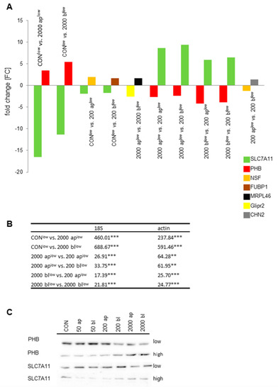 In the next step, we looked for the highest up- and down-regulated genes within the pool of basically regulated genes (186) in the pairwise comparisons of the microarray analyses (Figure 4A). SLC7A11 and PHB were the most common, which were significantly regulated. SLC7A11 was significantly down-regulated in the treatment groups of 2000 ap and bl when compared to the control. This was confirmed by qPCR (18S: Kruskal-Wallis; p < 0.001; Mann–Whitney Test; Figure 4B). Furthermore, we analyzed our data with a second housekeeper of β-actin and observed the same results (Kruskal–Wallis, p < 0.001; Mann–Whitney Test). In addition, 200 ap and 200 bl also showed a significant decrease in the microarray analyses, but not in qPCR (Figure 4B). In addition, we also examined SLC7A11 under high glucose consumption and found a significant reduction of the expression under 2000 ap, but not in 2000 bl (18S: ANOVA, F (6;96) = 4.811; p < 0.001; Table 2). The same result was detected using ß-actin (Kruskal–Wallis Test, p < 0.001; Mann–Whitney Test).