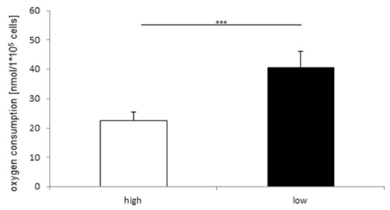 Oxygen consumption under high and low glucose concentration (N = 5). Oxygen consumption was measured under high and low glucose conditions. Under low glucose concentration, a higher oxygen consumption was observed than under high glucoses concentration (high: 22.54 nmol/L × 105 cells; low: 40.76 nmol/L × 105 cells, *** p < 0.001).