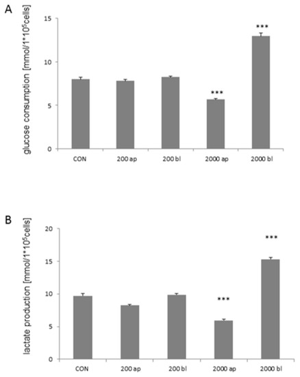 Furthermore, glucose consumption was analyzed in the apical and basolateral supernatants. Overall consumption was averaged and we found a significantly higher glucose consumption in 2000 bl (12.94 mmol/L × 105 cells; Welch ANOVA; p < 0.001; Games Howell; Figure 7A) when compared to all other treatment groups. On the other hand, we detected a significantly lower glucose consumption in 2000 ap when compared to all other groups (5.66 mmol/L × 105 cells; p < 0.001).