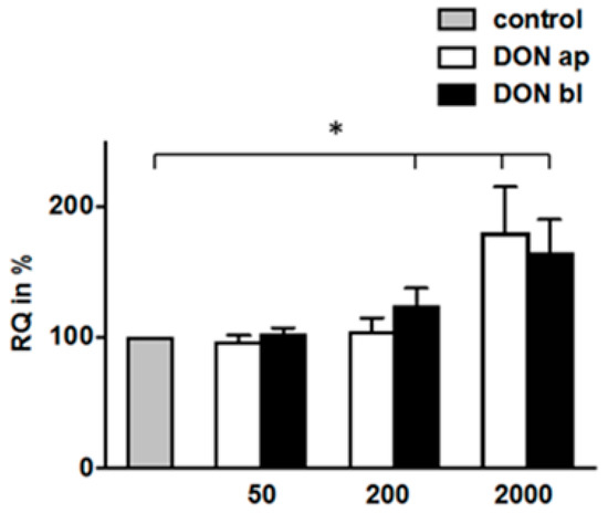 Analyses of protein biosynthesis under high glucose concentration (N = 3). After 72 h of DON treatment, cells were handled as described above. A significantly higher protein synthesis rate (RQ: relative quantification in %) was found in the 200 ng/mL bl, 2000 ng/mL ap and bl treatment groups. (p < 0.05 *).