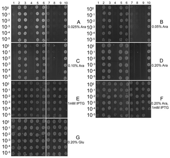 Effect of the induction of nine putative toxin-antitoxin (TA) modules, cloned separately into the selective expression vector, on E. coli growth. E. coli BL21 (DE3) pLysS cells, harboring the constructed pETBAD-0547-0548 (Lane 1), -0790-0791 (Lane 2), -0792-0791 (Lane 3), -0842-0841 (Lane 4), -0860-0861 (Lane 5), -1035-1034 (Lane 6), -1349-1348 (Lane 7), -1818-1817 (Lane 8), -1821-1820 (Lane 9), and pETBAD (Lane 10), were grown to OD600 of 0.6–0.8. Each culture was serially diluted, and 5-µL drops, with the concentration ranging from 100 (top) to 10−5 (bottom), were respectively spotted onto the plate, with different inducers. (A–D) 0.025%, 0.05%, 0.10%, and 0.20% l-arabinose were added successively to induce expression of putative toxins; (E) 1 mM isopropyl β-d-thiogalactopyranoside (IPTG) was added to induce the expression of putative antitoxins; (F) Both 0.20% l-arabinose and 1 mM IPTG were added to induce the expression of putative TA modules; (G) 0.20% d-glucose (repression conditions) was added as the control.