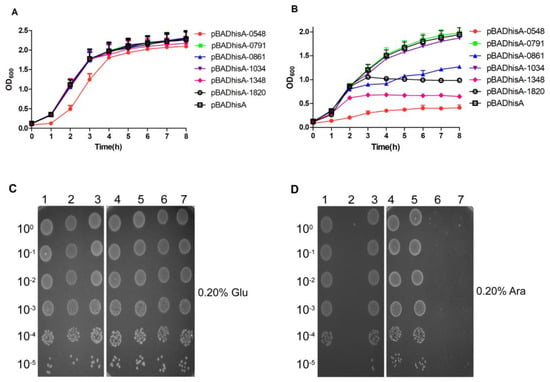 Overnight cultures of E. coli Top10 cells, carrying the plasmids of pBADhisA-0548, -0791, -0861, -1034, -1348, -1820 or pBADhisA (control), were diluted at 1:100 in LB-ampicillin, grown to OD600 of 0.6–0.8 and serially diluted, and 5-µL drops were spotted onto the different plates with 0.20% d-glucose or 0.20% l-arabinose. As shown in Figure 3C,D, the Top10 cells, carrying pBADhisA-0548, -1348 and -1820 (toxin genes of TA_1, TA_7, and TA_9) on the plate with 0.20% l-arabinose, exhibited obvious growth inhibition, while the Top10 cells, carrying pBADhisA-0791, -0861, and -1034, exhibited normal growth (Figure 3D). By contrast, no major difference in growth, between Top10 cells, carrying pBADhisA-0548, -0791, -0861, -1034, -1348, and -1820, and those carrying pBADhisA on the plate with 0.20% d-glucose was observed (Figure 3C). These results indicated that TA_1, TA_7, and TA_9 are potential type II TA systems.