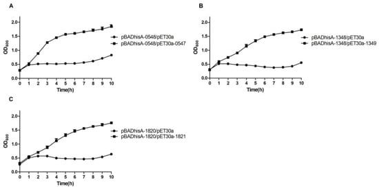 To determine whether the toxic effect of each toxin can be alleviated by its cognate antitoxin, the sequence of each putative antitoxin was cloned separately into the pET30a plasmid. Additionally, the resulting plasmids were designated as pET30a-antitoxin (pET30a-0547, -1349, and -1821). E. coli BL21 (DE3) pLysS cells, harboring pBADhisA-0548 and pET30a-0547 (or pET30a, as control), pBADhisA-1348 and pET30a-1349 (or pET30a, as control), and pBADhisA-1820 and pET30a-1821 (or pET30a, as control), were successfully obtained by co-transformation and selection with ampicillin and kanamycin. When BL21 (DE3) pLysS cells, harboring these plasmids, were grown to OD600 of 0.20–0.30, each culture was supplemented with 0.20% l-arabinose and 1 mM IPTG. The induction of TA_1 (Figure 4A), TA_7 (Figure 4B), and TA_9 (Figure 4C) resulted in normal growth, while BL21 (DE3) pLysS cells, carrying both pBADhisA-toxin and pET30a plasmids, demonstrated a significant growth inhibition (Figure 4A–C), suggesting that the putative antitoxins of TA_1, TA_7, and TA_9 could neutralize the cognate toxin.